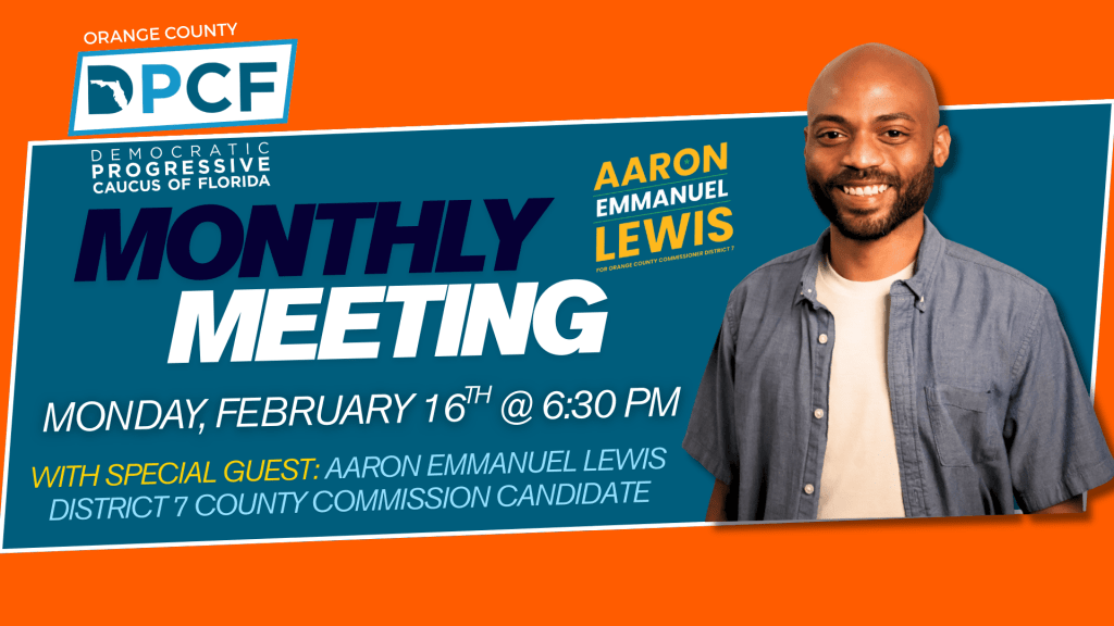 The Orange County Progressive Caucus invites you to our hybrid Monthly Meeting on Monday, February 16th at 6:30 PM. This meeting will feature Aaron Emmanuel Lewis, candidate for Orange County District 7 Commissioner, who will share his platform and vision for people-first leadership. Aaron is a United States Army veteran, a member of the LGBTQ+ community, a husband, the son of an immigrant, and a grassroots progressive committed to building a more just and inclusive Orange County. Please register to receive the meeting link and in-person location.