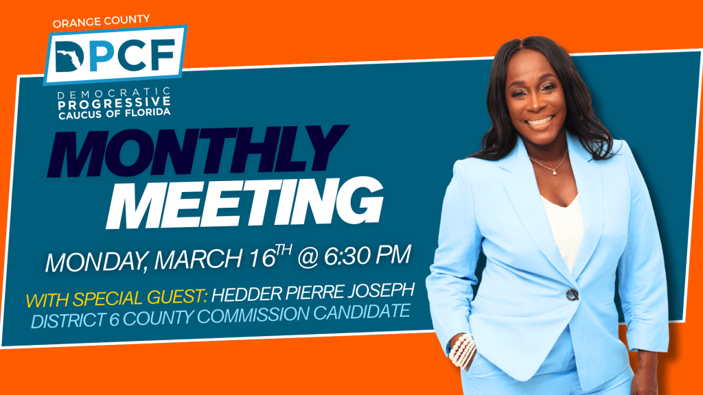 Join the Orange County Progressive Caucus for our hybrid Monthly Meeting on Monday, March 16th at 6:30 PM, featuring guest speaker Hedder Pierre Joseph, candidate for Orange County Commission District 6. Born in Nassau, Bahamas to Haitian immigrant parents, Hedder came to South Florida as an undocumented immigrant at a young age and became a legal resident in 1994. She has lived in Orange County since 2003 and has long served the community as an educator, business owner, youth mentor, advocate, real estate agent, and active member of New Covenant Baptist Church. Passionate about immigration, business development, sustainable housing, youth empowerment, and increased access for persons with disabilities, Hedder is committed to giving voice to the voiceless and working alongside residents to “Push for Progress” across District 6. Please register to receive the meeting link and in-person location.
