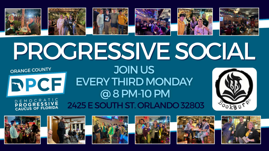 After our usual Orange County Democratic Progressive Caucus meeting on the third Monday of each month, keep the energy going and join us for a post-meeting social from 8:00–10:00 PM at Book Burn, a locally owned bar located at 2425 E. South St., Orlando, FL 32803.